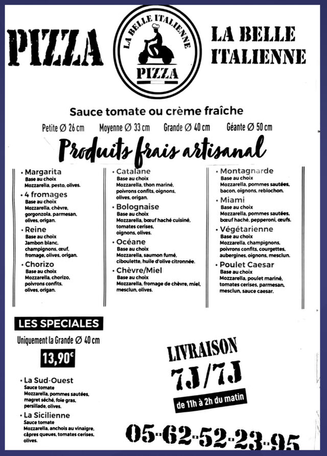 La Belle Italienne vous propose un menu varié de plats italiens traditionnels, où la célèbre pizza et ses nombreuses variantes, sont bien sûr à l’honneur !